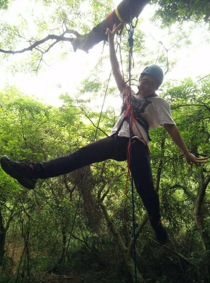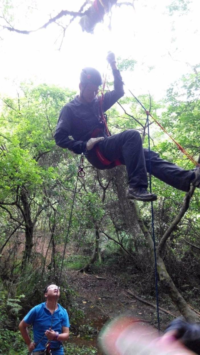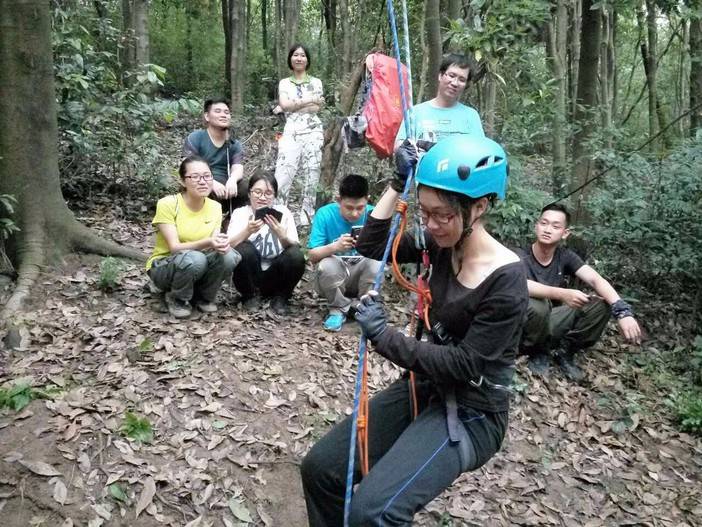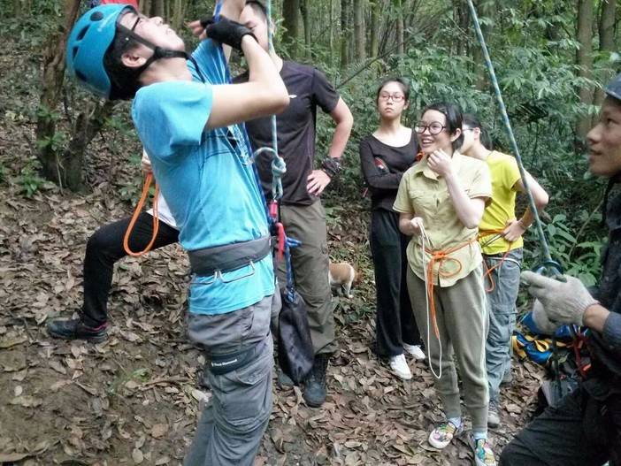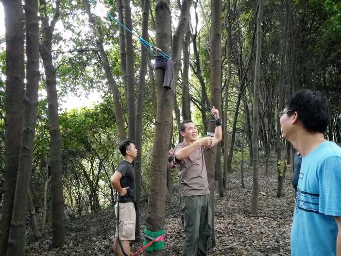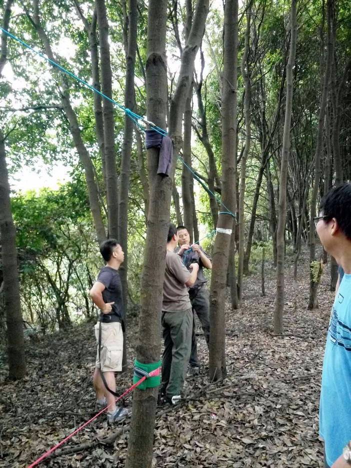 绳索上升开始了,首先找到合适的歪脖村,扁带,主锁,8字扣,静力登山绳,安全带全用上了,抓结上升。还有最后一项,绳索下降,用8字扣,意大利班扣下降,这对我来说是新项目,我们大家都反复结,不亦乐乎!活动总有结束的时候,每次都觉得时间不够用,天色不早了,得趁天黑前来张集体照,手机的声控拍照功能派上用场了。完美的一天结束,野人教给大家的东西掌握了多少?只怕三天不练手生,还给老师了。勤能补拙,自己有时间私下好好练习!下次再参加野人举办的免费技能交流。再次感谢野人,感谢大家!