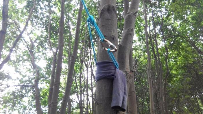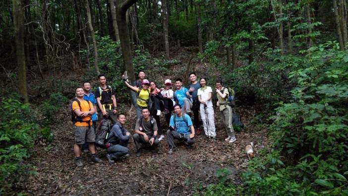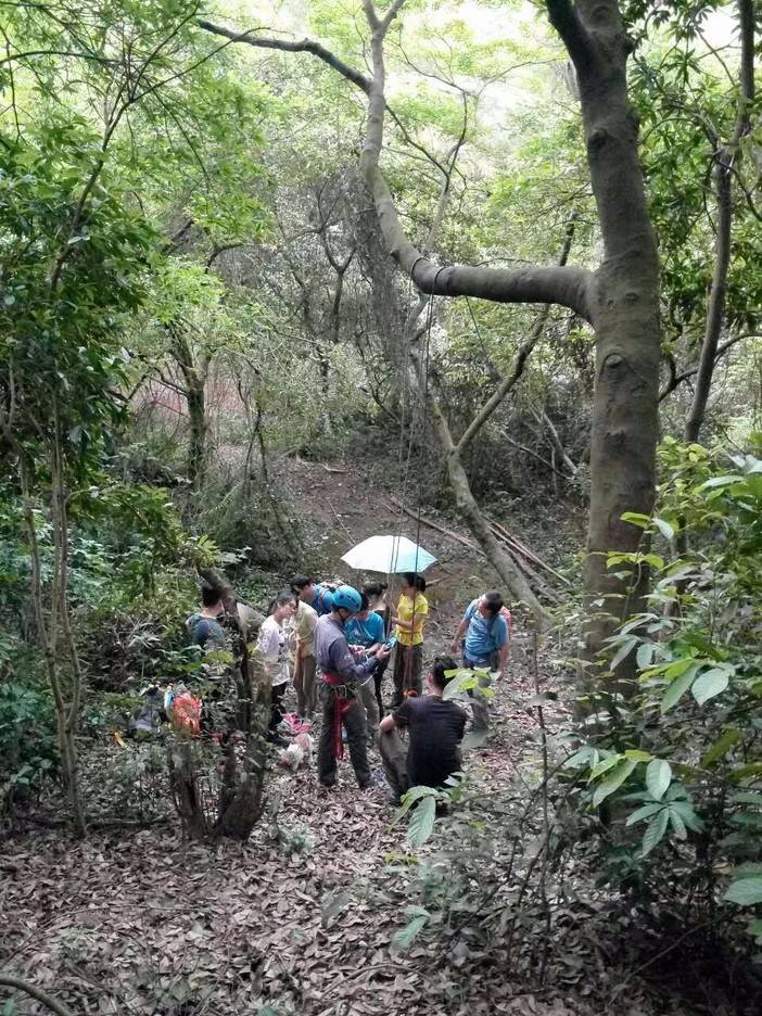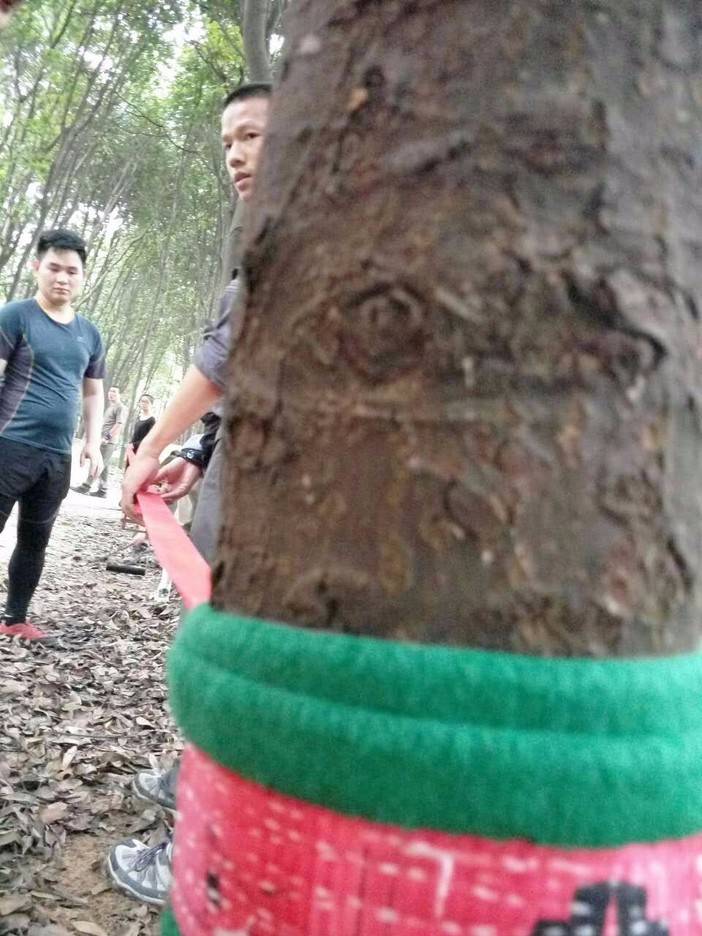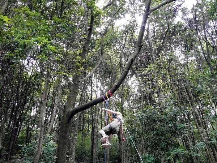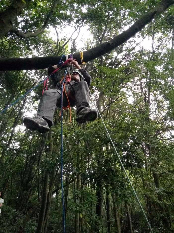 绳索上升开始了,首先找到合适的歪脖村,扁带,主锁,8字扣,静力登山绳,安全带全用上了,抓结上升。还有最后一项,绳索下降,用8字扣,意大利班扣下降,这对我来说是新项目,我们大家都反复结,不亦乐乎!活动总有结束的时候,每次都觉得时间不够用,天色不早了,得趁天黑前来张集体照,手机的声控拍照功能派上用场了。完美的一天结束,野人教给大家的东西掌握了多少?只怕三天不练手生,还给老师了。勤能补拙,自己有时间私下好好练习!下次再参加野人举办的免费技能交流。再次感谢野人,感谢大家!