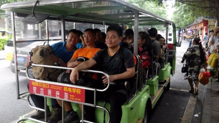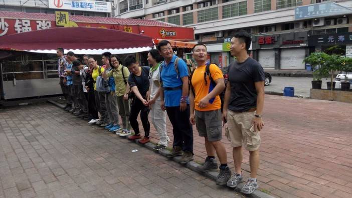 介绍结束,排成一排,14人,四部对讲机,开始出发坐车前往目的地京溪森林公园这个车比较坑,没到目的地,我们还得要步行。