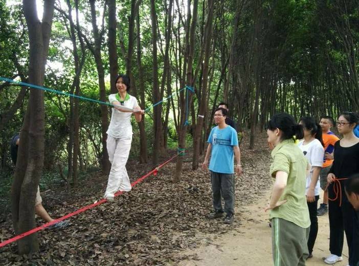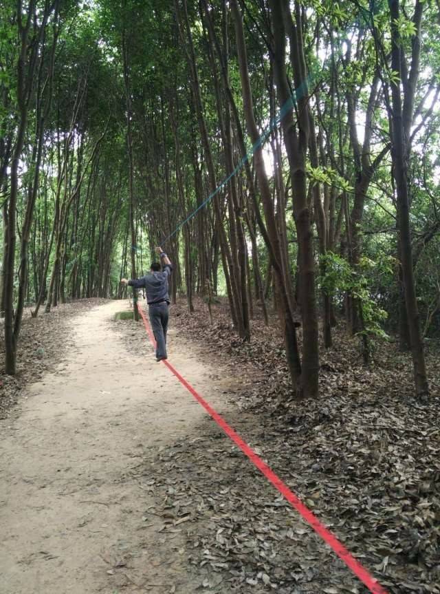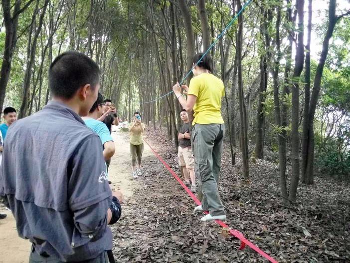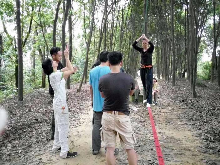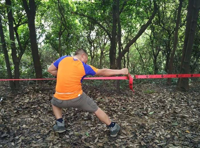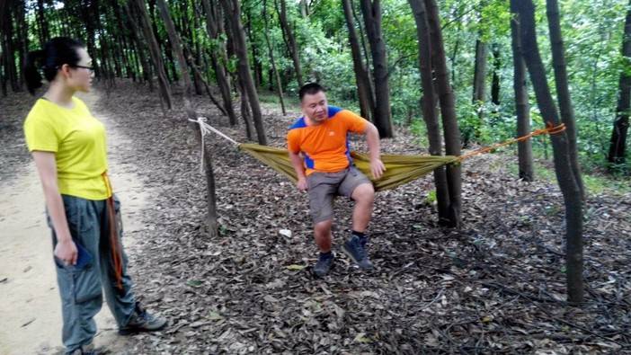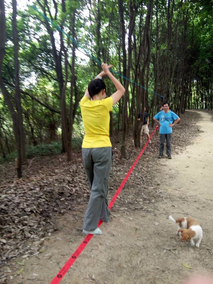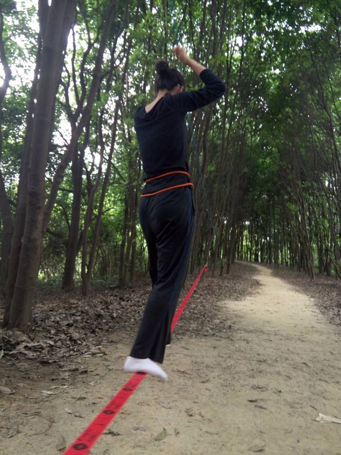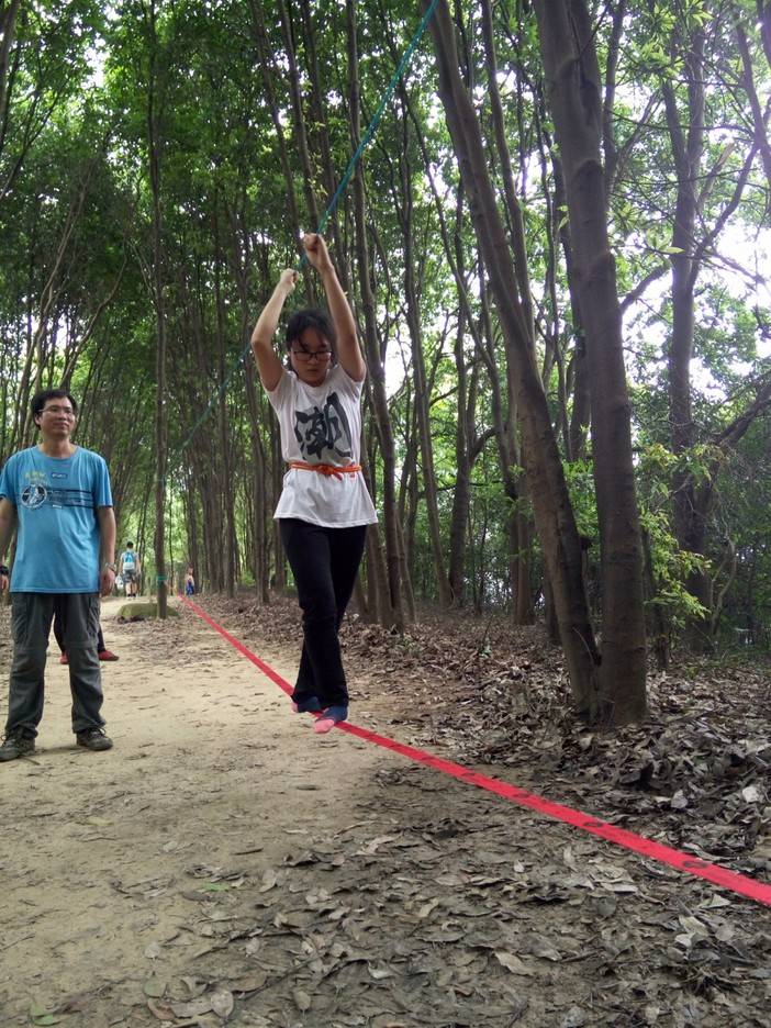 休重较轻,平衡感比较好的击跆道女生先脱鞋上,可能以前没接触过,刚开始晃得厉害,不过还是有基础的人,很快就上手了,掌握了技巧,走个全程来回也不是难事。这两位趁大家练习的间隙,活学活用,抓布结用上了,雨衣拿来做了吊床。