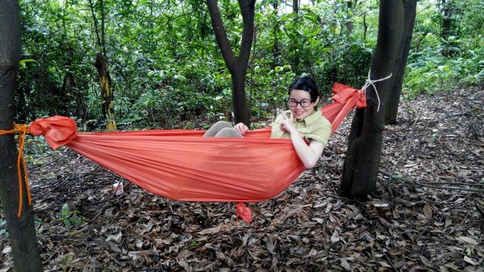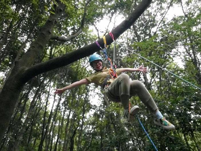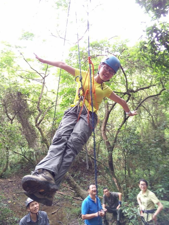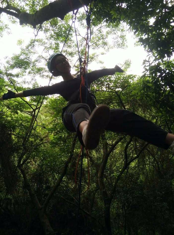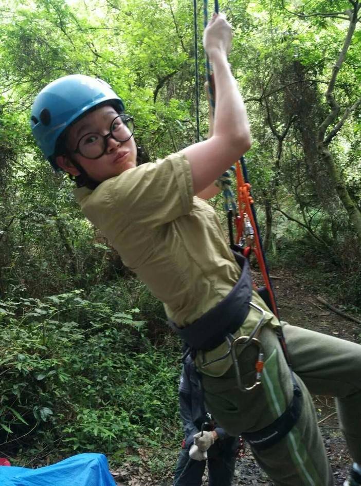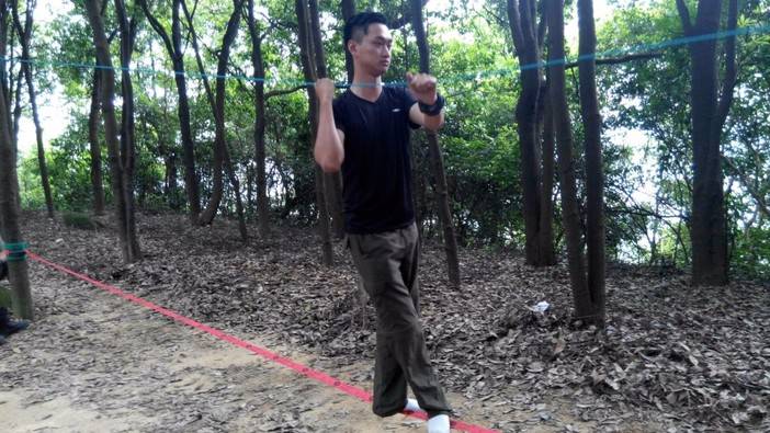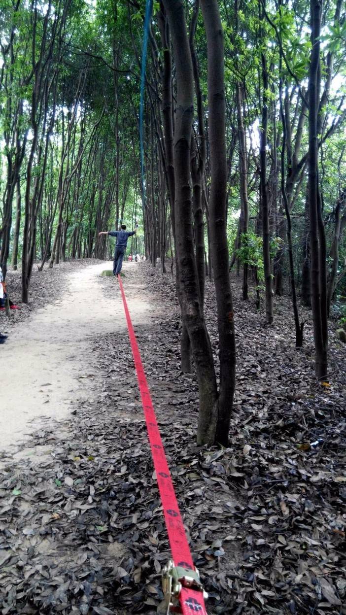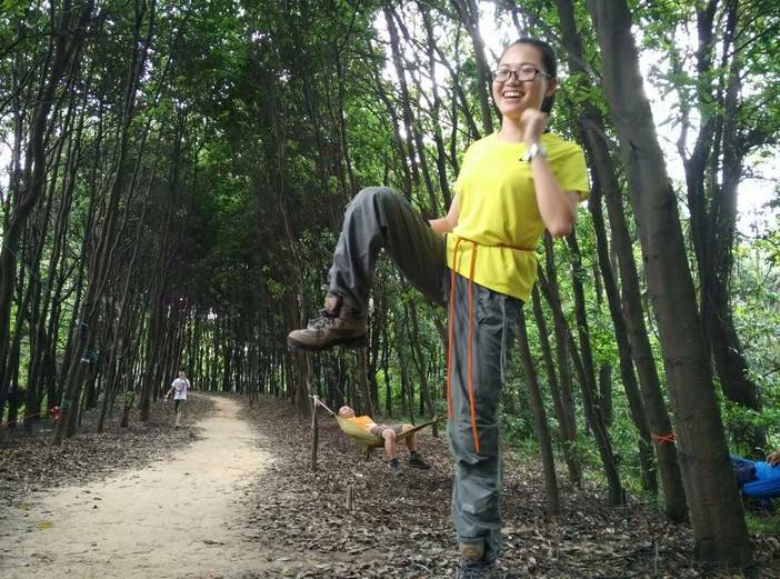 休重较轻,平衡感比较好的击跆道女生先脱鞋上,可能以前没接触过,刚开始晃得厉害,不过还是有基础的人,很快就上手了,掌握了技巧,走个全程来回也不是难事。这两位趁大家练习的间隙,活学活用,抓布结用上了,雨衣拿来做了吊床。