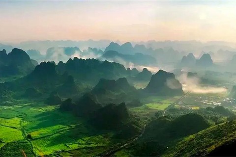 恰逢春日,英西峰林田间的油菜花开花季节,为峰林增添一层诗意。
