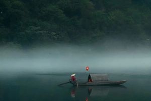 渔翁乘一叶扁舟,自雾中悠悠驶来