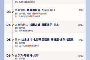 4、景交:九寨沟观光车淡季80元/人、旺季90元/人(必须)、达古冰川观光车70元/人(必须)+往返索道180元/人(必须)、毕棚沟观光车70元/人(必须)+电瓶车20-30元/人(分段计费、可选);