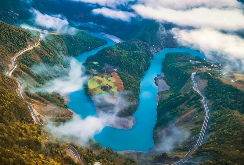 独龙江游玩结束后乘车前往【丙中洛】,临近丙中洛,观千里“U”形半圆形大湾【怒江U形湾】、远观【桃花岛】这里充满荒情野趣,全无雕琢痕迹,这里空气清新甜美,全无浮尘雾霭,这里天空蔚蓝如拭,全无碳酸污染,这里充盈着质朴的美,粗犷的美,宁静的美。