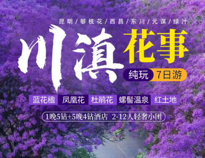 昆明&西昌蓝花楹-攀枝花&绿汁凤凰花-东川红土地金黄小麦-绿汁工业小镇-七里坝杜鹃花-螺髻99里瀑布温泉-元谋土林-斗南花市7天深度游(2-12人轻奢小团 | 升级1晚5钻酒店+5晚4钻酒店 | 蓝花楹双层观光巴士 | 畅泡瀑布温泉 | 烟斗老人摆拍)