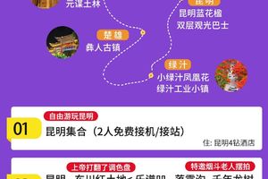 另有篆新农贸市场、文林街、大观楼、海晏村日落、捞鱼河湿地公园、斗南湿地公园等自由组合搭配。昆明各景点离市区较近,乘坐公交或打车均很便利。